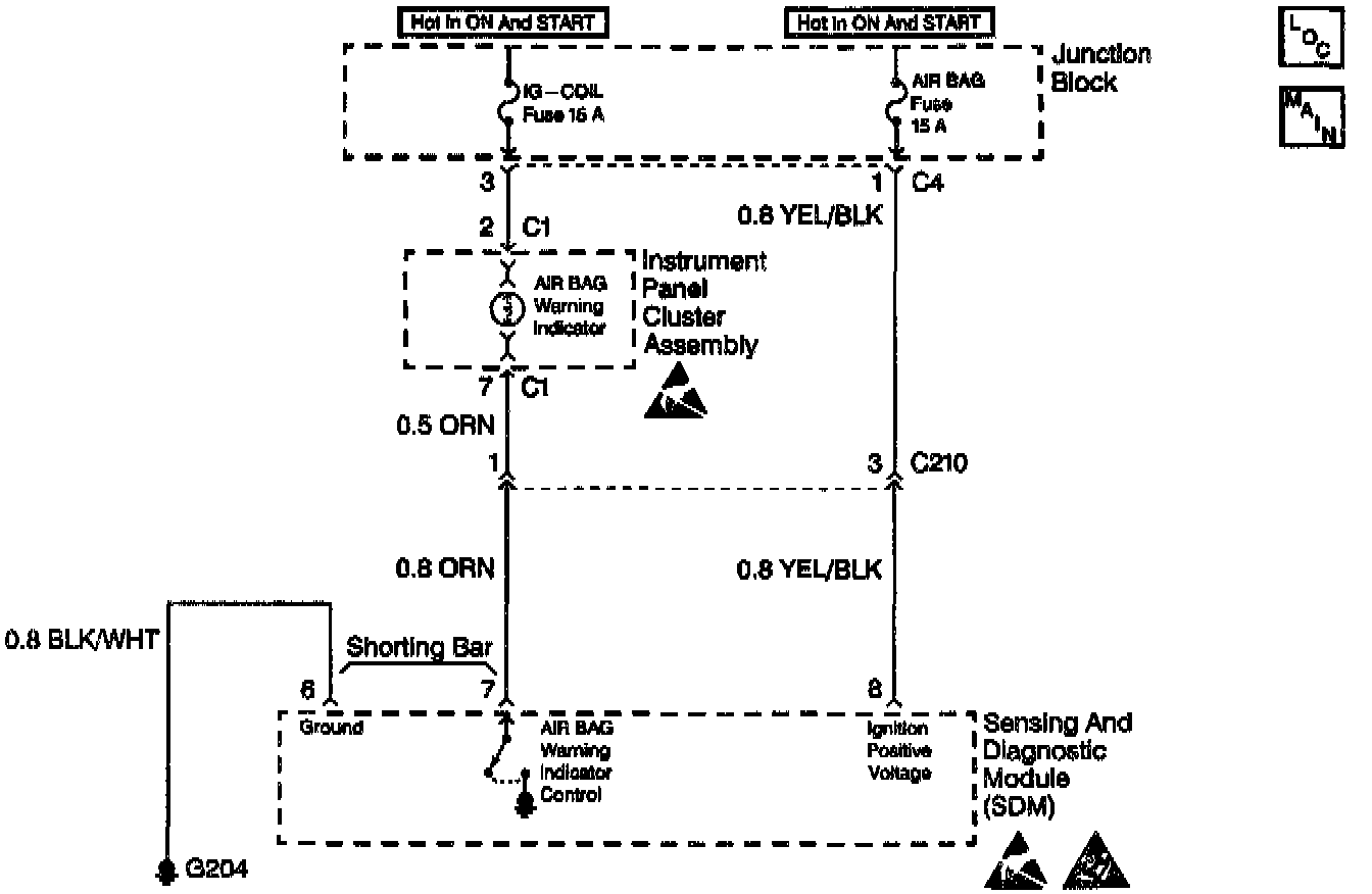 The ignition switch uses the AIR BAG Fuse for supplying Ignition 1 voltage to the Inflatable Restraint Sensing and Diagnostic Module (SDM) at terminal 8. When you first turn the ignition switch to the ON position, the SDM responds by flashing the AIR BAG warning lamp seven times. Then the SDM turns the lamp Off, while performing tests on the SIR system.