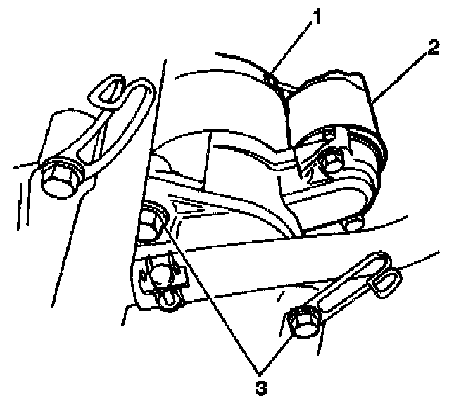 1. Install the starter motor assembly (1) to the vehicle. Secure the assembly with two mounting bolts (3).