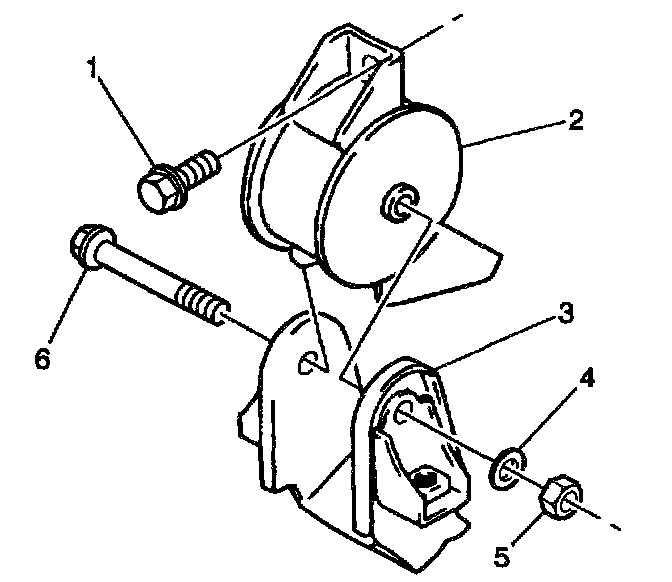 27. Remove the rear transaxle mount through-bolt (6) and the nut (5) from the rear transaxle mount (2).