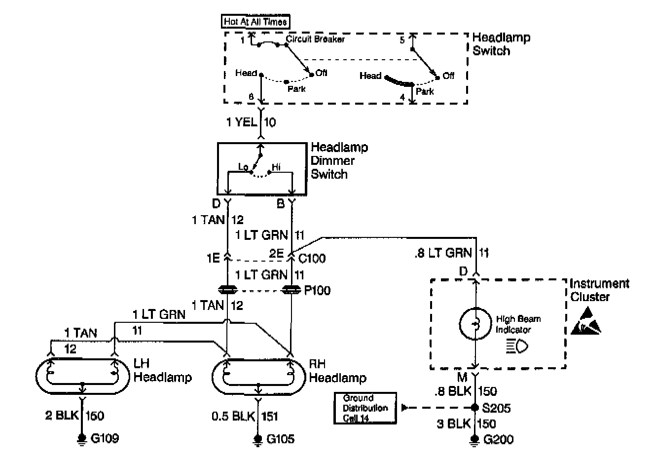 At this point analyze and (diagnose the problem), and develop text. Since the high beam indicator illuminated when the headlamp dimmer switch was in the high position, the high contacts of the headlamp dimmer switch and the LT GRN wire between the headlamp dimmer switch and C100 are good. At this point, it is extremely unlikely that the high beam filaments in the RH and LH headlamps are both open or that both headlamp connections are bad. The cause must be a bad connection at C100 or an open in the LT GRN wire between C100 and the RH headlamp.
