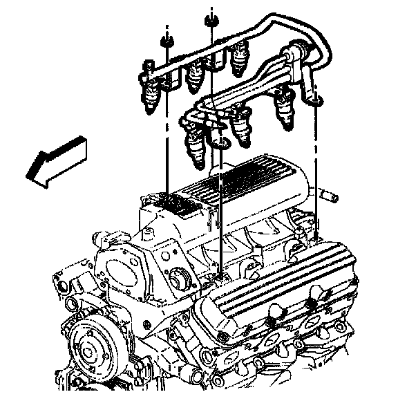 14. Remove the front fuel injector on each side of the fuel rail. The fuel rail will now clear the intake manifold.
