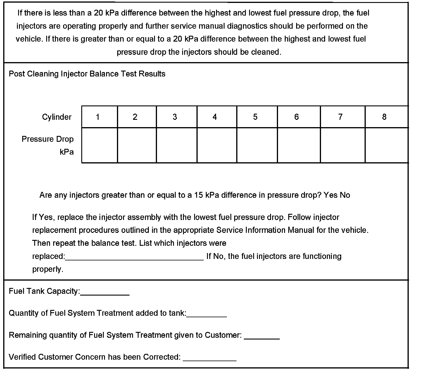 Technicians must record the results of all injector balance tests and keep them with the repair order. For your convenience, the bulletin has a worksheet shown for recording the test results.