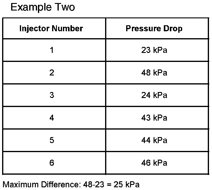 6. Subtract the lowest pressure drop, leanest injector, from the highest pressure drop, richest injector. If there is greater than or equal to a 20 kPa difference between the lowest and highest pressure drop, then the fuel injectors may be the cause of the driveability symptom. See the example tables shown to determine if cleaning is appropriate.
