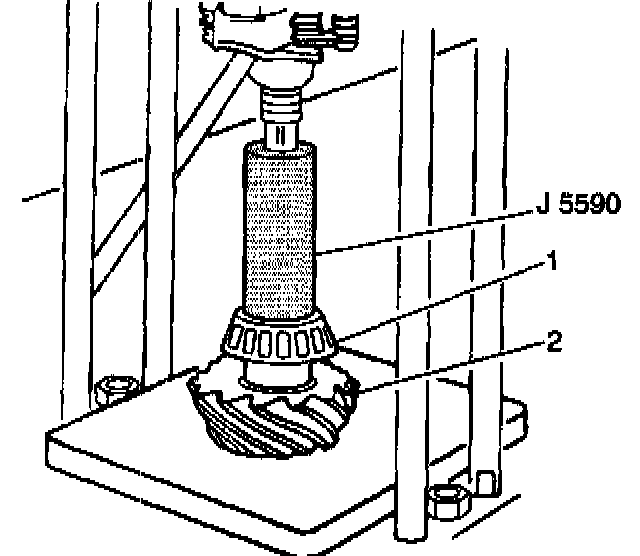 1. Use J 5590 in order to install the inner drive pinion gear bearing (1) onto the drive pinion gear (2).