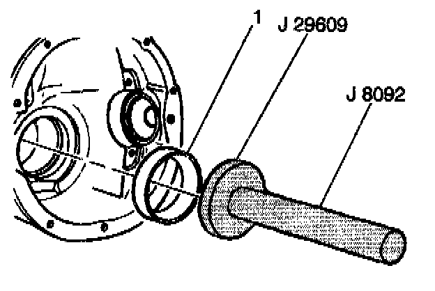 2. Use J 8092 and J 29609 in order to drive the inner bearing race (1) into the rear axle housing, if the inner drive pinion gear bearing was replaced.