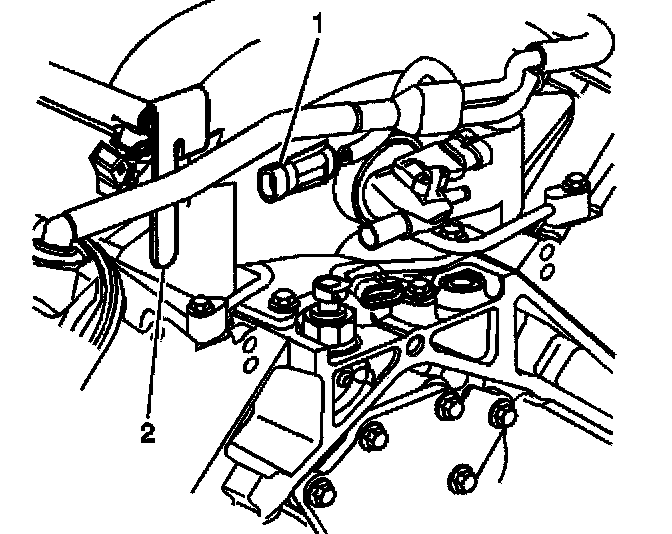 6. Install the knock sensor wire harness connector (1) onto the fuel rail stop bracket (2).