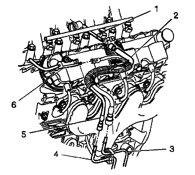 4. Disconnect the fuel feed hose (2) from the fuel rail (1).