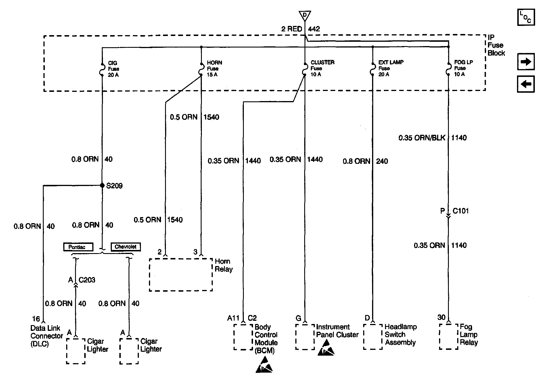 Power Distribution Schematics: LT HDLP, CIG, HORN, CLUSTER, EXT LAMP, and FOG LP Fuses: