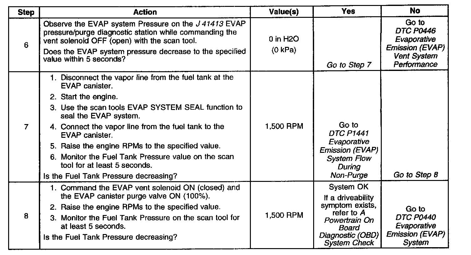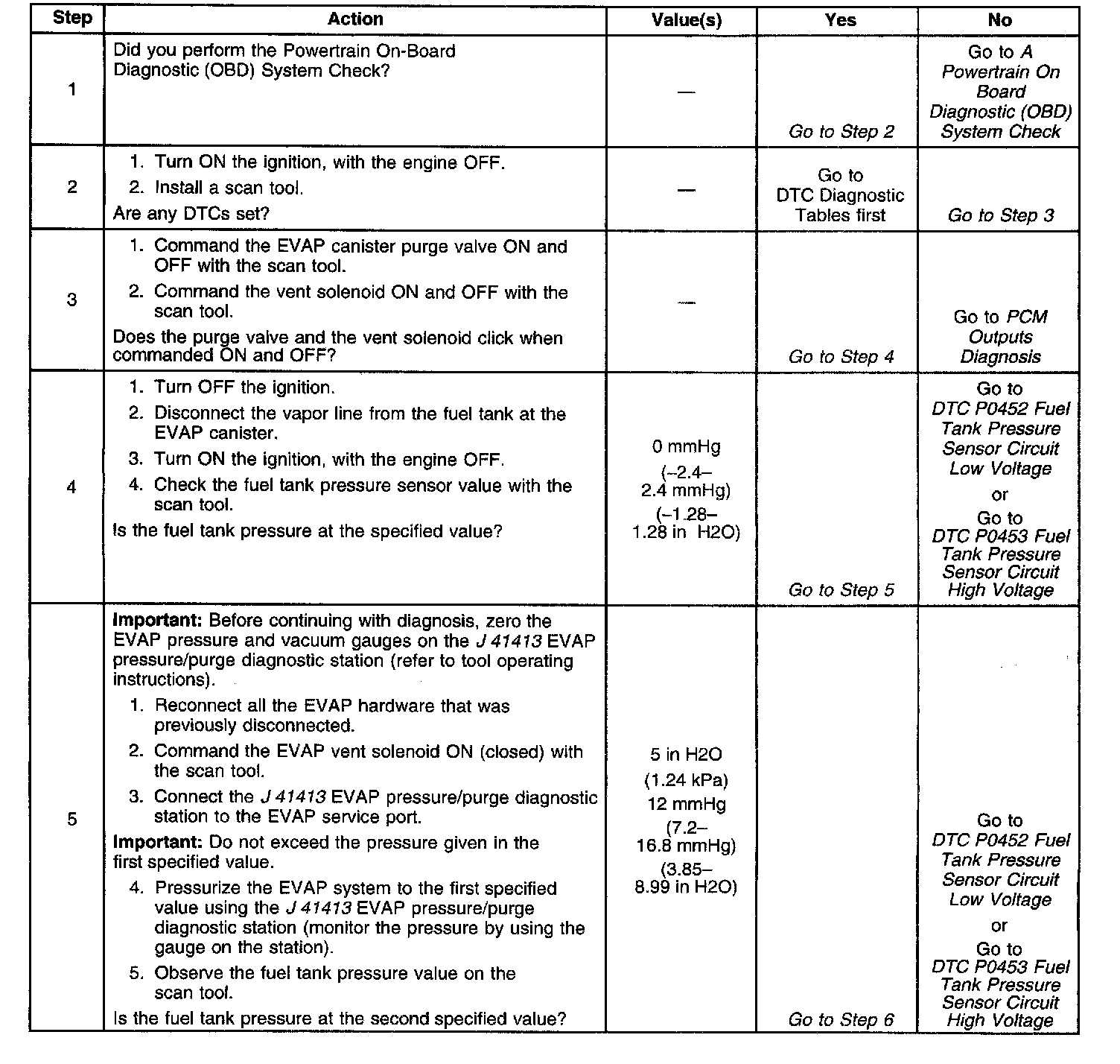 ^ Fuel tank pressure sensor operation is covered and diagnosed in DTCs P0440, P0442, P0446, P0452, P0453, P1441, and Evaporative Emission System Check.