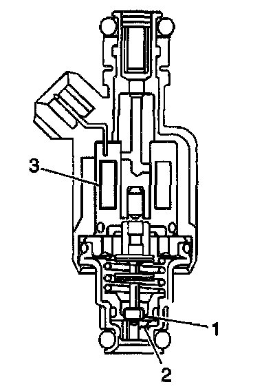 The fuel injector assembly is a solenoid-operated device, controlled by the PCM, that meters pressurized fuel to a single engine cylinder. The PCM energizes the fuel injector solenoid (3), which opens a ball valve (1), allowing fuel to flow past the ball valve, and through a recessed flow director plate (2) at the injector outlet. The director plate has machined holes that control the fuel flow, generating a conical spray pattern of finely atomized fuel at the injector tip. Fuel from the tip is directed at the intake valve, causing the fuel to become further atomized and vaporized before entering the combustion chamber. A fuel injector that is stuck partly open would cause loss of pressure after the engine is shut down, so long crank times would be noticed on some engines. Dieseling could also occur because some fuel could be delivered to the engine after the ignition is turned OFF.