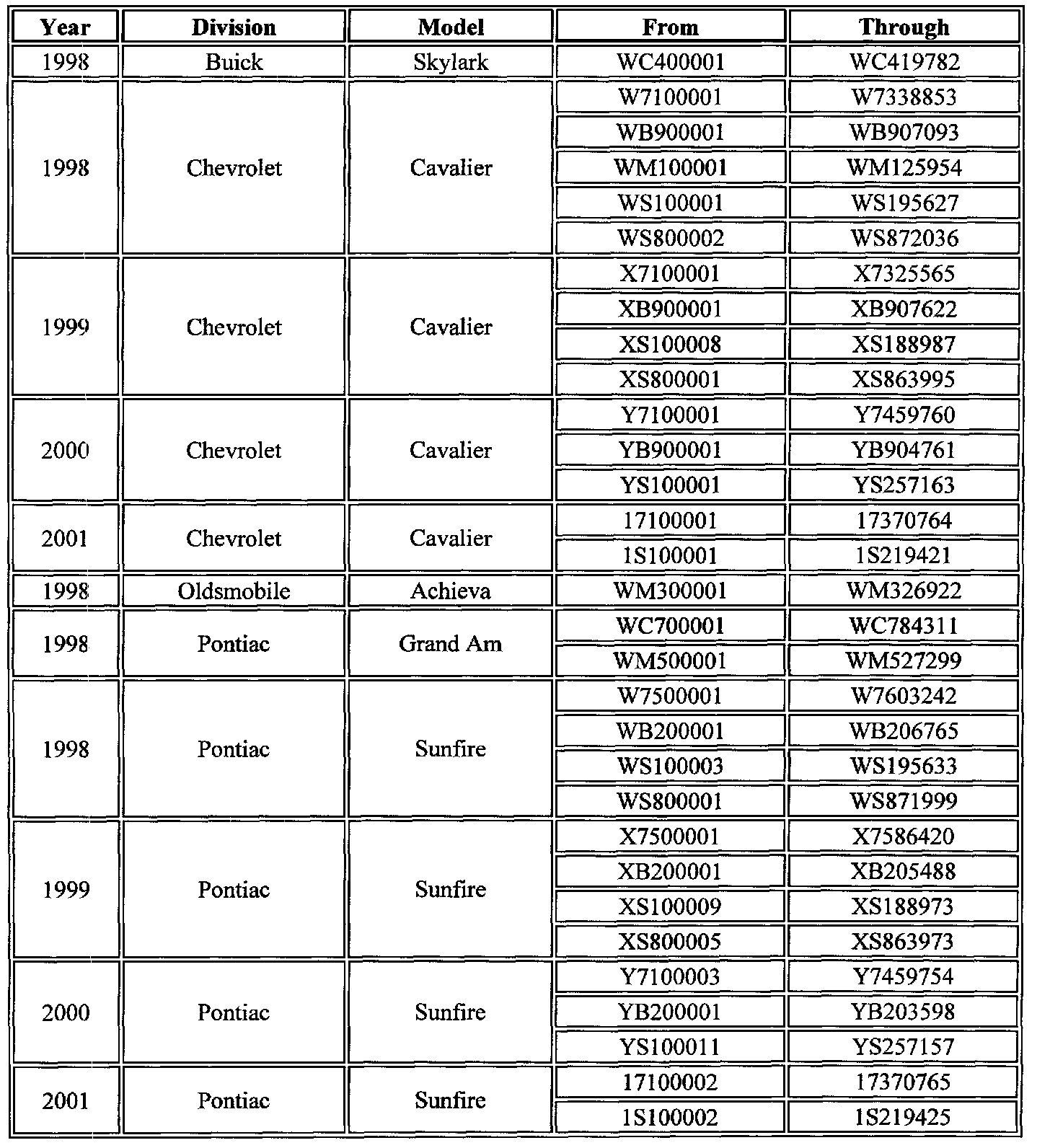 Involved are certain 1998 model year Buick Skylark; 1998-2001 model year Chevrolet Cavalier; 1998 model year Oldsmobile Achieva; 1998 model year Pontiac Grand Am; and 1998-2001 model year Pontiac Sunfire vehicles built within the VIN breakpoints shown.