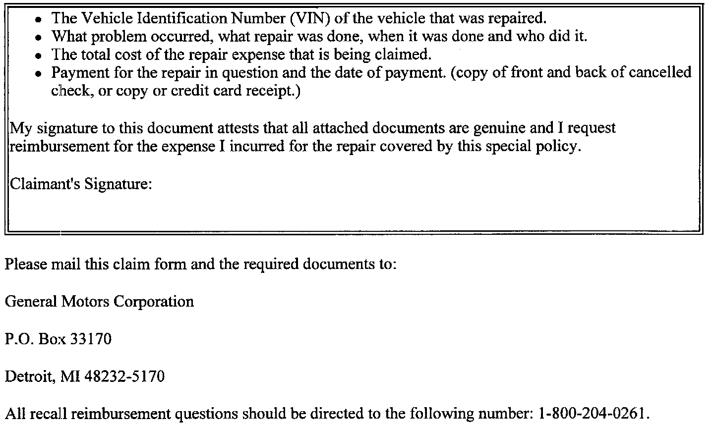 ^ Incomplete, you will receive a letter from General Motors identifying the documentation that is needed to complete the claim and offered the opportunity to resubmit the claim when the missing documentation is available.