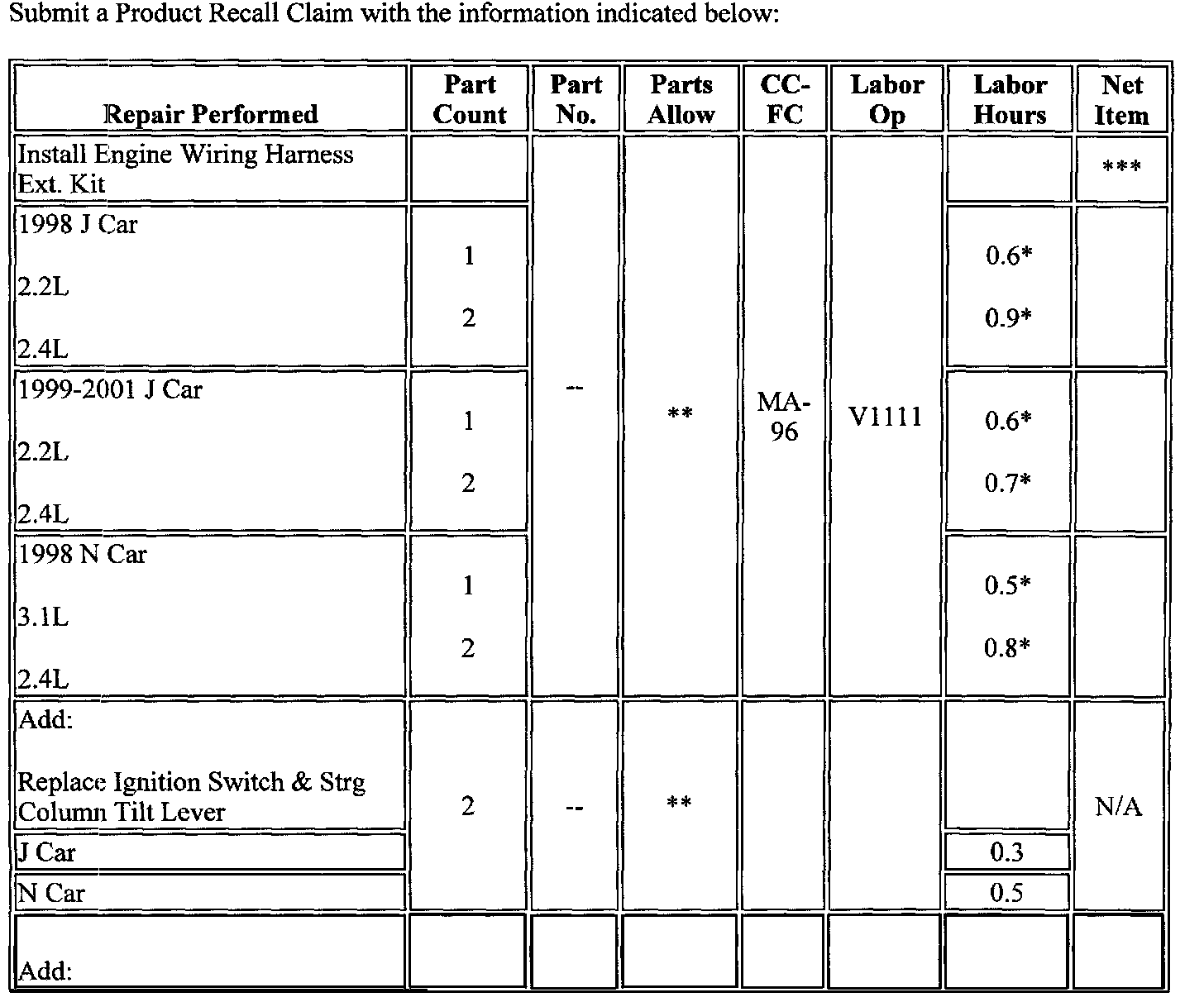 Customer requests for reimbursement of previously paid repairs for ignition switch replacement and related wiring repairs due to the condition addressed in this bulletin are to be submitted by June 30, 2005.