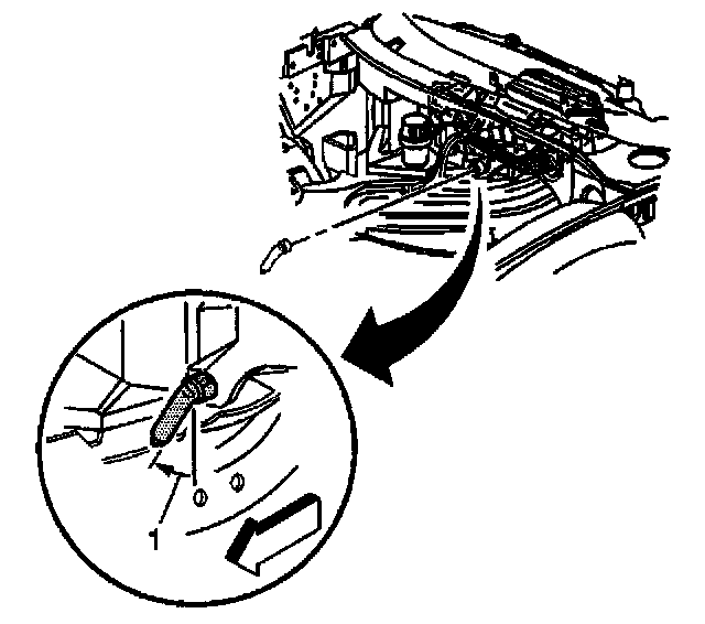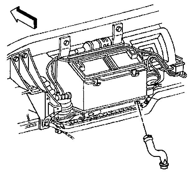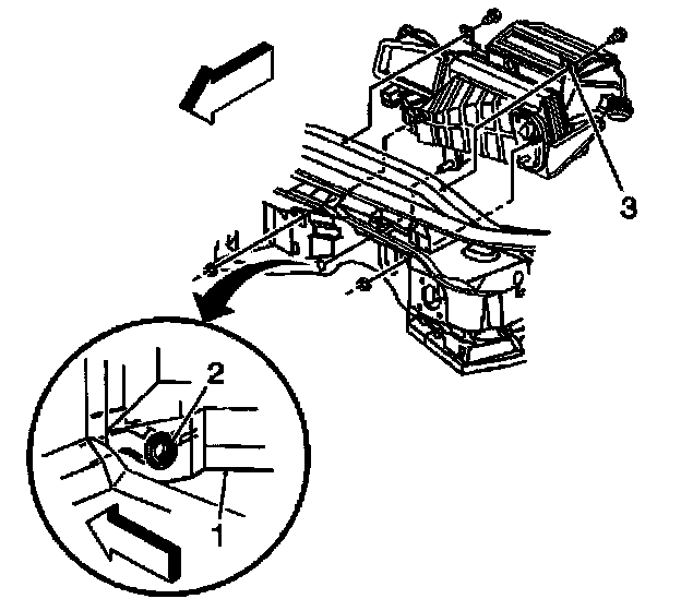 37. Install the evaporator and HVAC module drain tube to the module. Orientate the drain tube to contact the dash panel as shown (1).