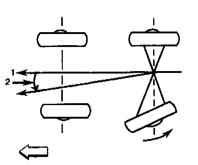 Thrust Angles DescriptionThe front wheels aim or steer the vehicle. The rear wheels control tracking. The tracking action is relative to the thrust angle (2). Thrust angle (2) is defined as the path that the rear wheels will take. The thrust angle (2) should be aligned with the body centerline (1).