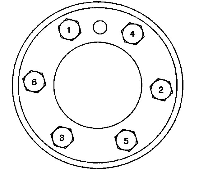 1. Tighten the engine flywheel bolts first pass in sequence to 20 Nm (15 ft. lbs.).