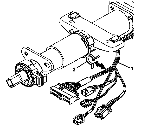 2. Remove the wire harness straps (2) from the steering column lilt head assembly (1) and the column.