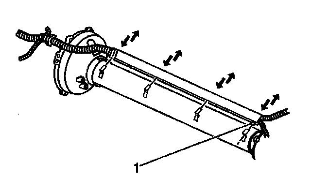 49. Carefully pull the wiring harness down into the L-shaped brackets along the driveline support assembly, align the harness retainer (locator) (1) to the hole in the forward bracket, then secure in place.