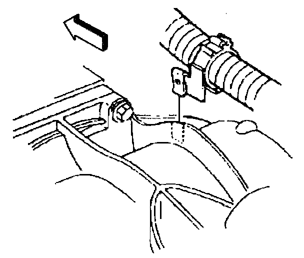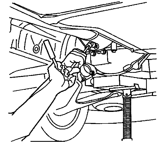 14. Insert a putty knife, or similar tool, between the edge of the shifter bracket on the side of the driveline support assembly and the brake pipe retainer on the wall of the driveline tunnel.