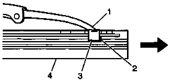 2. The wiper blade element (4) has two notches at one end which are engaged by the bottom claw set (3) of the wiper blade (1). At the notched end of the wiper blade (2), pull the blade element from the wiper blade (1).