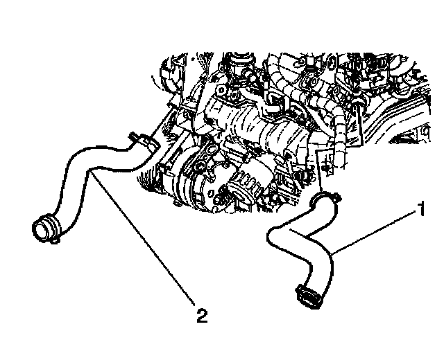 3. Use the J 38185 in order to reposition the hose clamp at the thermostat housing. Disconnect the inlet hose (1) from the thermostat housing