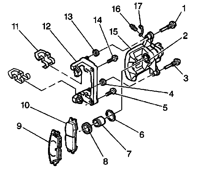9. Remove the two pad clips (11) from the caliper bracket.