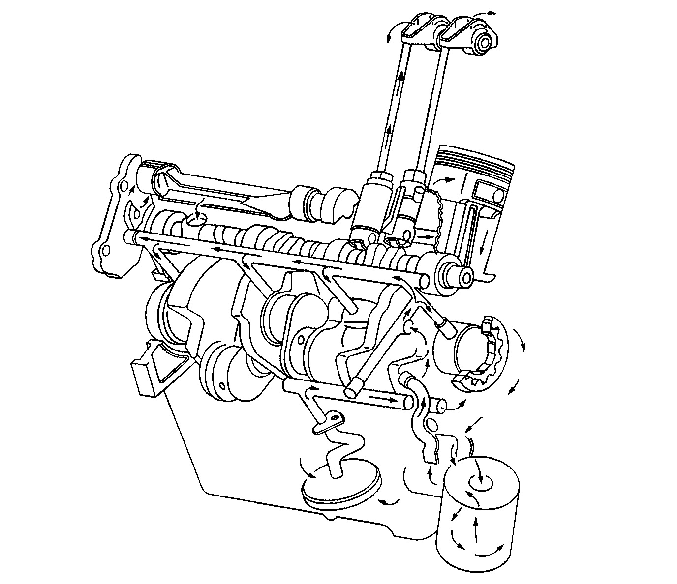 Oil is transferred from the crankshaft bearings to the connecting rod bearings through holes drilled in the crankshaft. Pistons, piston pins, and cylinder walls are lubricated by oil splash from the crankshaft and connecting rods.