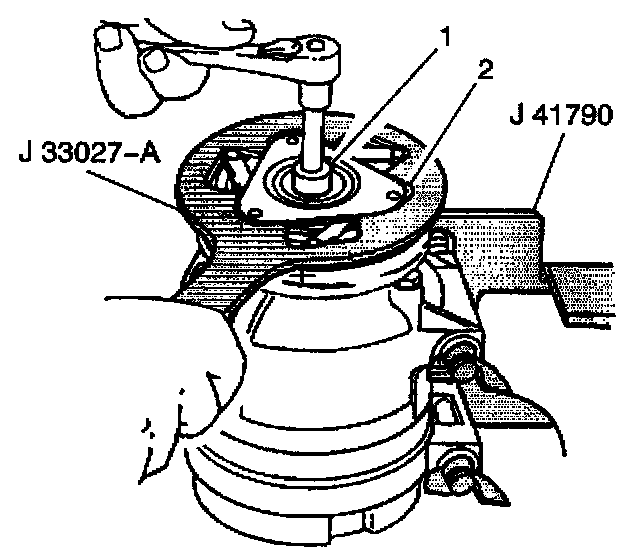 2. Hold the clutch hub and drive plate assembly (2) in place using the J 33027-A.