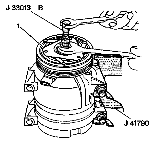 5. Remove the hub and drive plate assembly (1) by turning the center screw into the body of the hub and drive plate installer and against the compressor shaft.