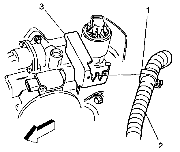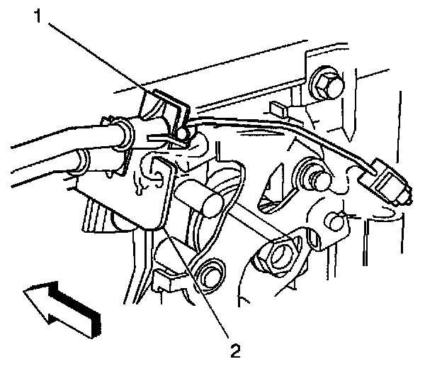 9. Disconnect the electrical harness retainer clip (1) and harness (2) from the accelerator control cable bracket (3) if applicable.