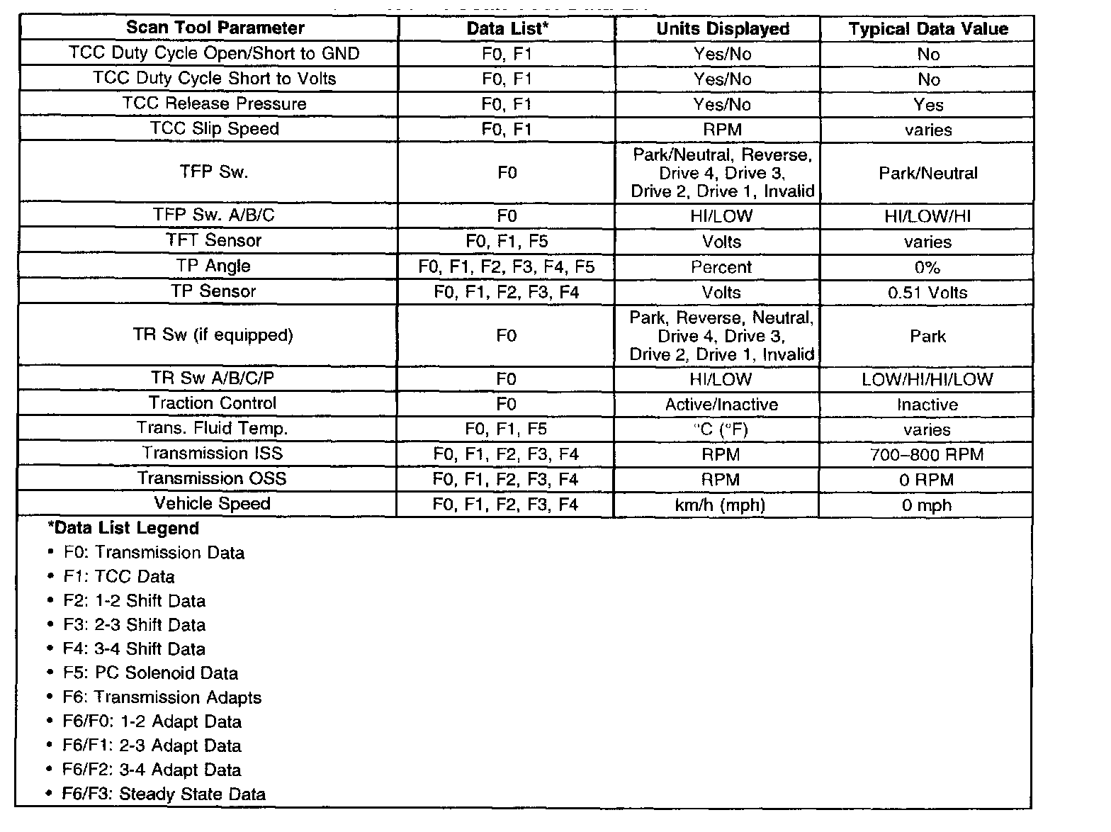 Only the parameters listed below are used in this manual for diagnosing. If a scan tool displays other parameters, the values are not recommended by General Motors for use in diagnosis. Scan tool values below were recorded under the following conditions: