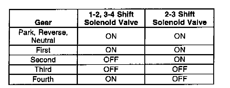The shift solenoid valves are two identical, normally open, electronic exhaust valves that control upshifts and downshifts in all forward gear ranges. These shift solenoid valves work together in a combination of ON and OFF sequences in order to control the positions of the 1-2, 2-3 and 3-4 shift valve trains. The PCM monitors numerous inputs in order to determine the appropriate solenoid state combination and the transmission gear for the vehicle operating conditions.