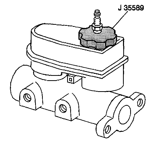 4. After making sure tank valve is off, to prevent spray of fluid from air pressure in the line. Connect the J 35589 to the brake fluid reservoir.