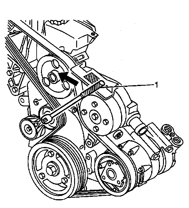 3. Install the drive belt under the drive belt tensioner pulley by lifting or rotating the drive belt tensioner, using a 3/8-inch breaker bar (1).