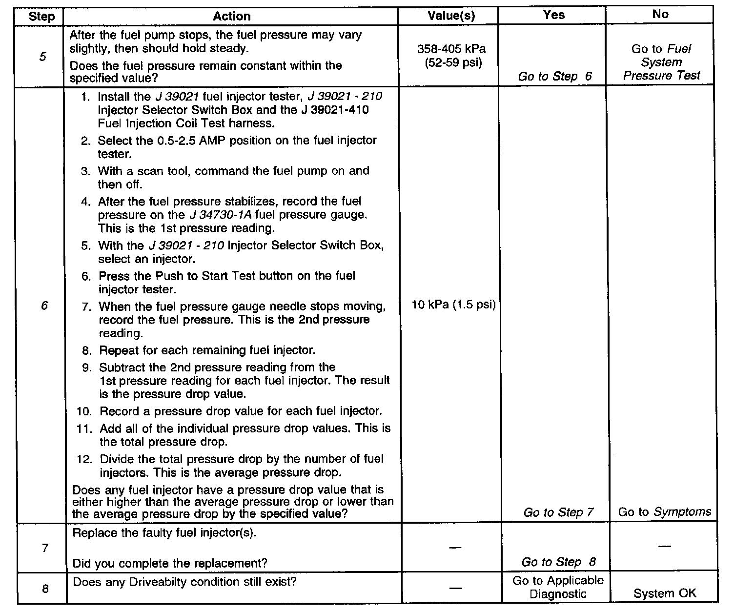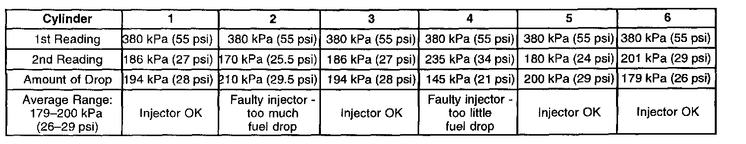 6. If the pressure drop value for each fuel injector is within 10 kPa (1.5 psi) of the average pressure drop value, the fuel injectors are flowing properly. Calculate the pressure drop value for each fuel injector by subtracting the second pressure reading from the first pressure reading. Refer to the Injector Balance Test Example.