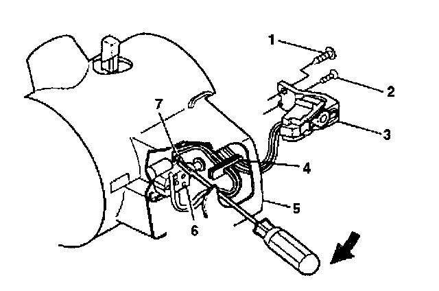 3. Remove the round washer head screw (1) from the pivot and pulse dimmer switch assembly (3).