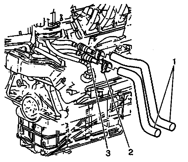 2. Squeeze the tabs on the quick-connect (3) in order to disconnect the heater hose (1) from the heater pipe.
