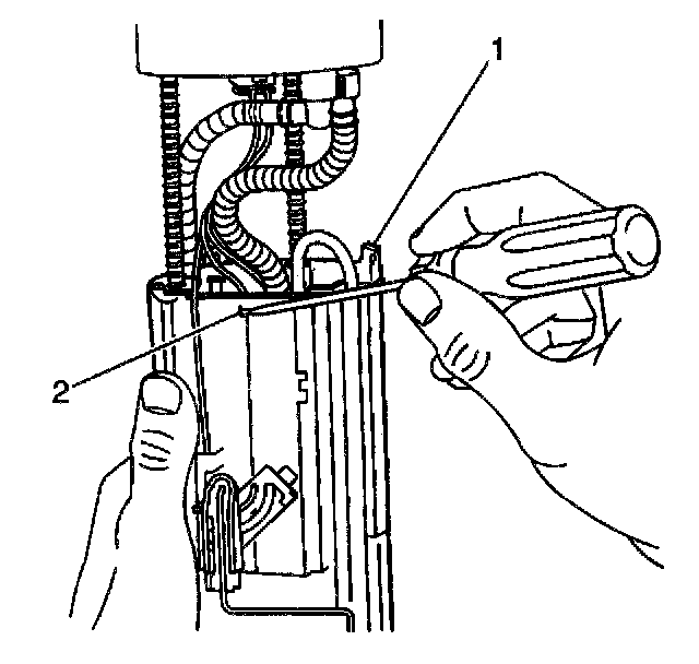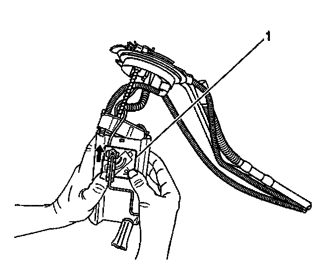 8. Depress the tab on the fuel level sensor (1) while sliding up and out of the housing.
