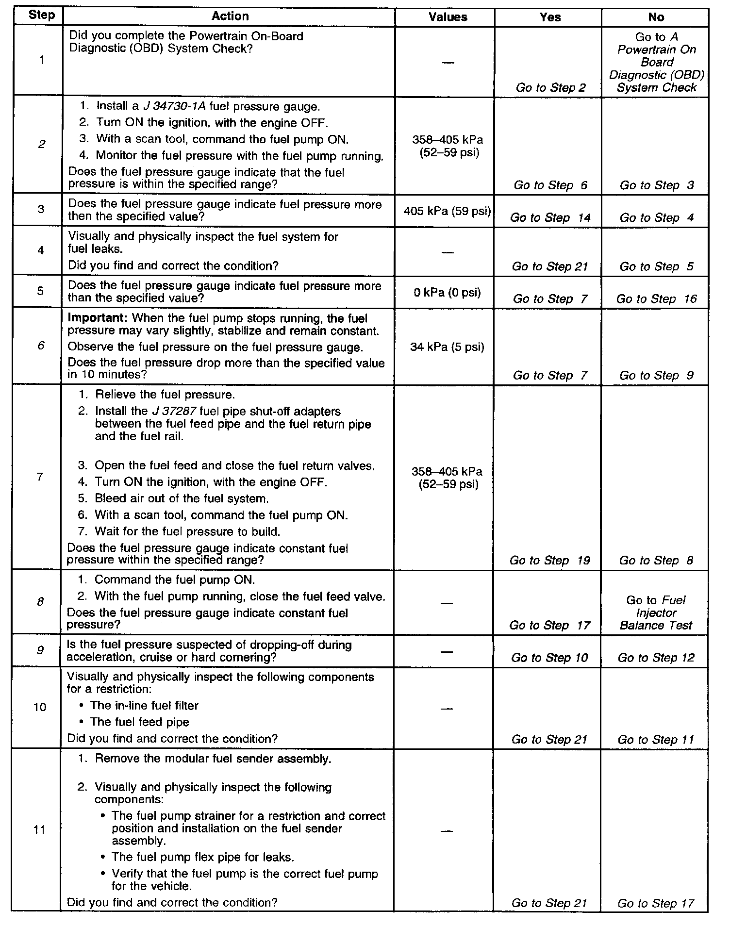9. Fuel pressure that drops-off during acceleration, cruise, or hard cornering may cause a lean condition. A lean condition can cause a loss of power, surging, or misfire and may be diagnosed using a scan tool. If an extremely lean condition occurs, the oxygen sensors may drop below 500 mV and the fuel injector pulse width will increase.