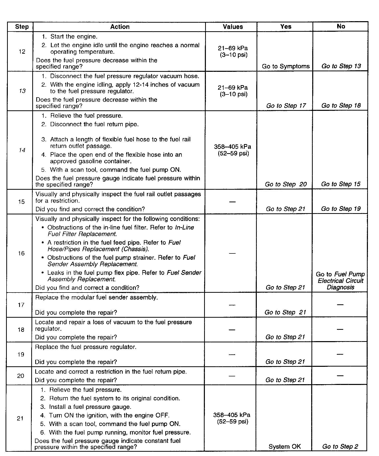 14. This test determines if the high fuel pressure is due to a restricted fuel return pipe or fuel pressure regulator. A rich condition may cause a DTC P0132 or DTC P0172 to set. Driveability conditions associated with rich conditions can include hard starting (followed by black smoke) and a strong sulfur smell in the exhaust.