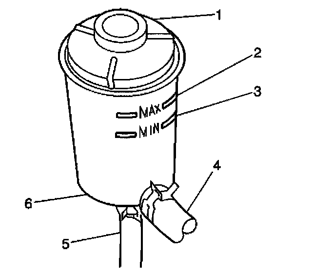 2. Inspect for the power steering fluid in the reservoir (6) for foaming or a milky appearance. Foaming and a milky appearance indicate either the existence of air in the system or the fluid level is too low.