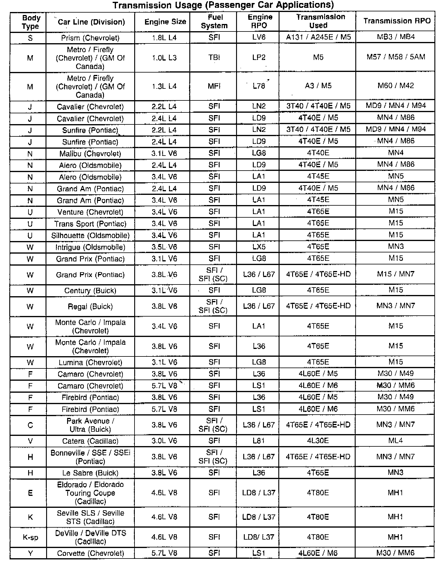 Transmission Usage (M/L And G Van Applications):
