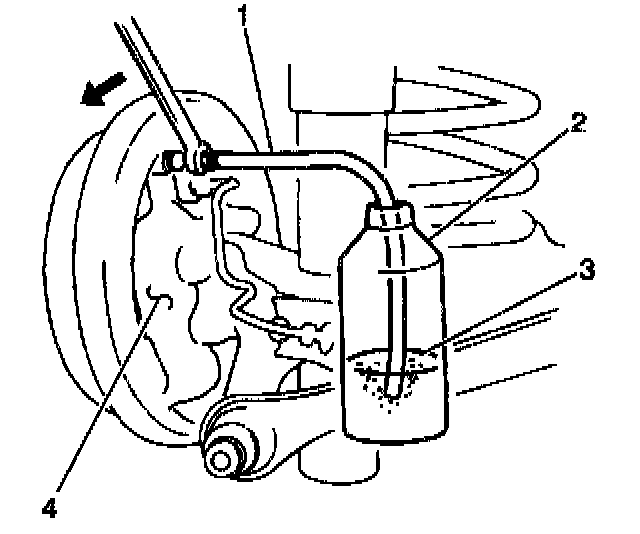 6. With the brake pedal completely pressed, loosen the bleeder valve by one half turn. The brake pedal falls all the way to the floor when brake fluid flows out of the bleeder valve into the clear fluid container.