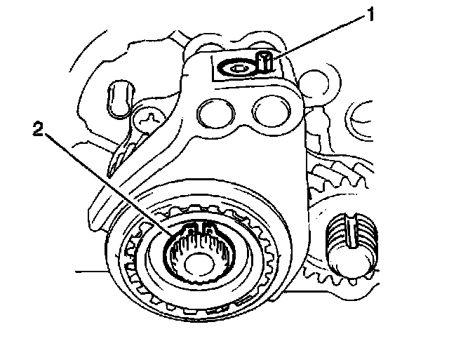 Important: During installation of the 5th speed gearshift fork and the 5th speed sleeve and hub onto the input shaft, make sure to align the hub oil groove (2) with the input shaft mark (1).