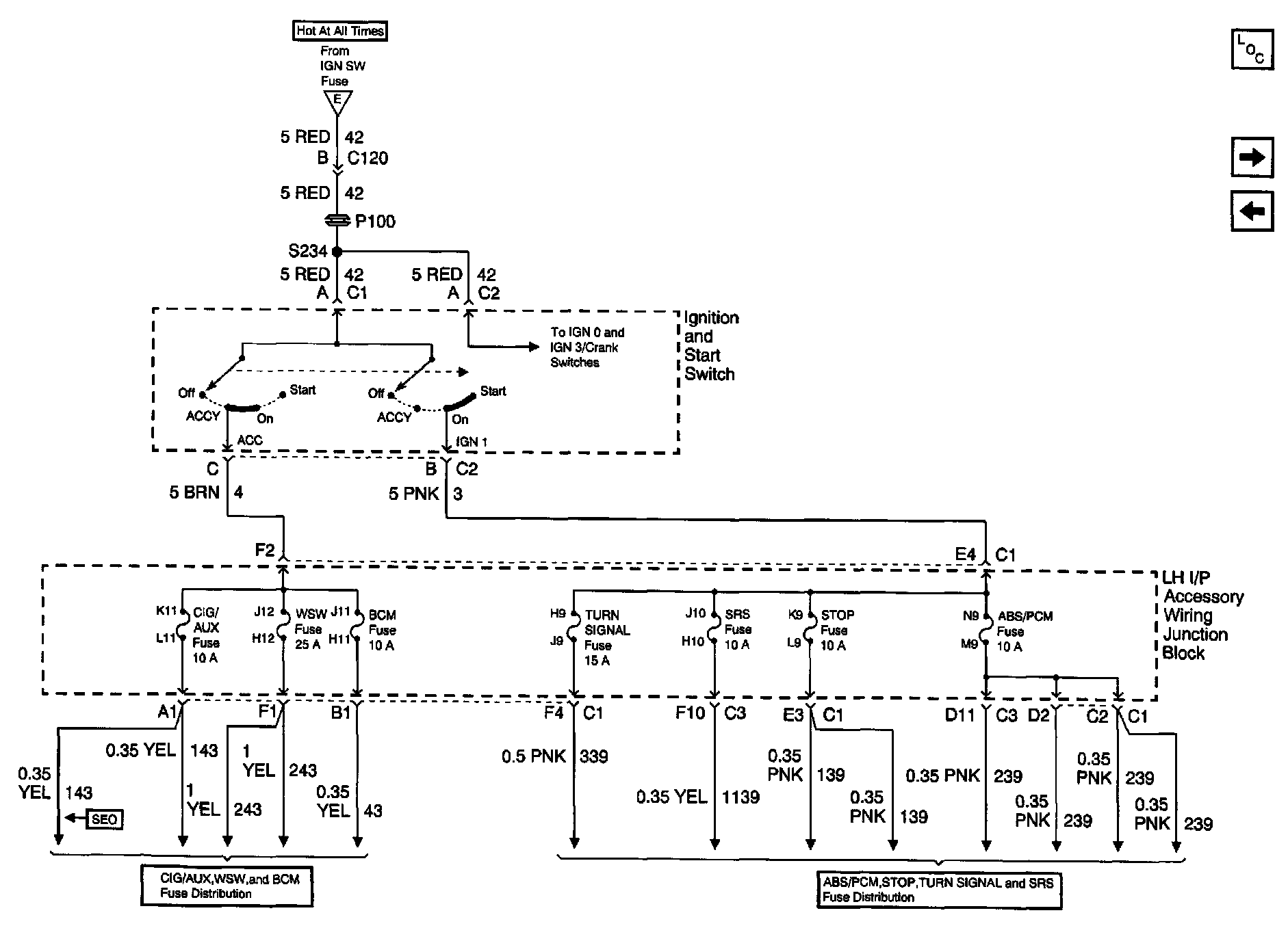 Power Distribution Schematics: Ignition And Start Switch And CIG/AUX, WSW, BCM, TURN SIGNAL, SRS, STOP And ABS/PCM Fuses: