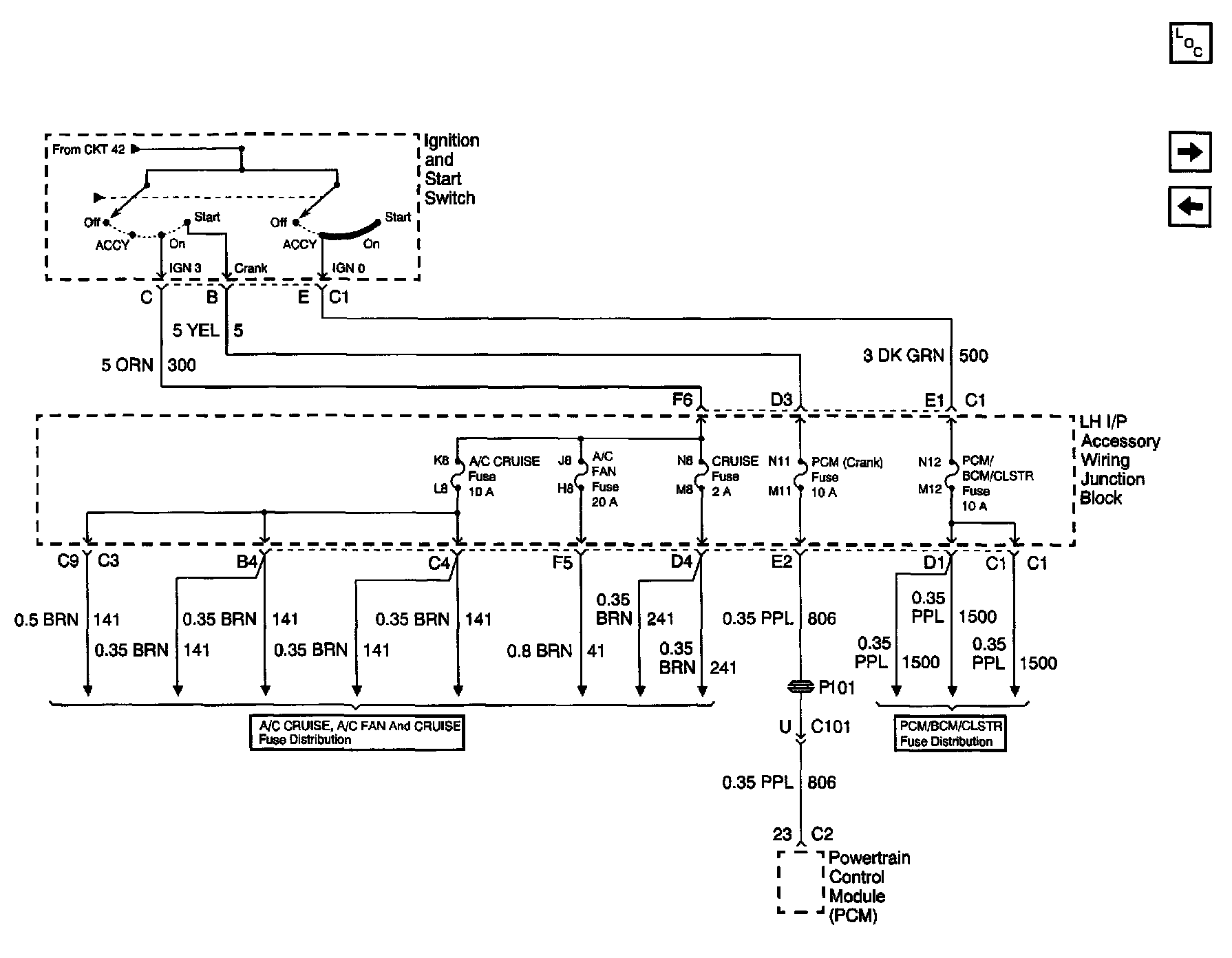 Power Distribution Schematics: Ignition And Start Switch And A/C CRUISE, A/c FAN, CRUISE, PCM (Crank) And PCM/BCM/CLSTR Fuses: