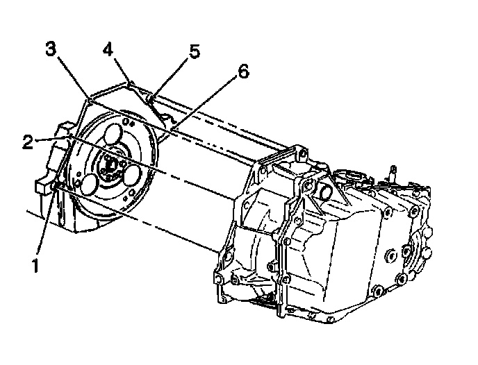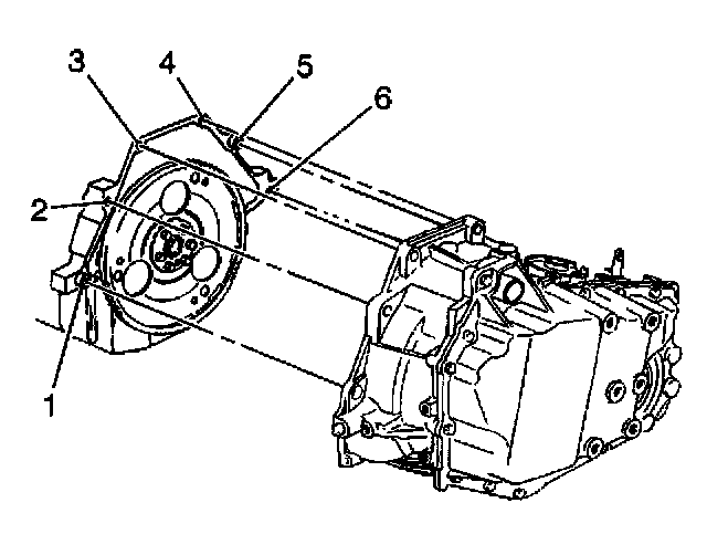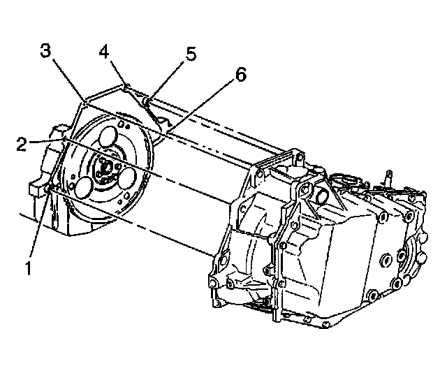 Tighten the upper transaxle-to-engine bolt (6) and stud (1) to 75 Nm (55 ft. lbs.).