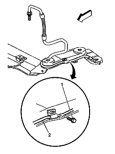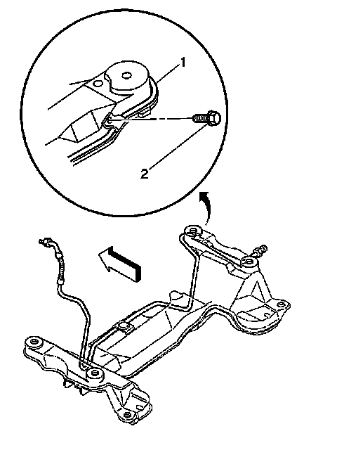 8. Remove the brake pipe clip bolt (2) from the passenger side of the crossmember (1).