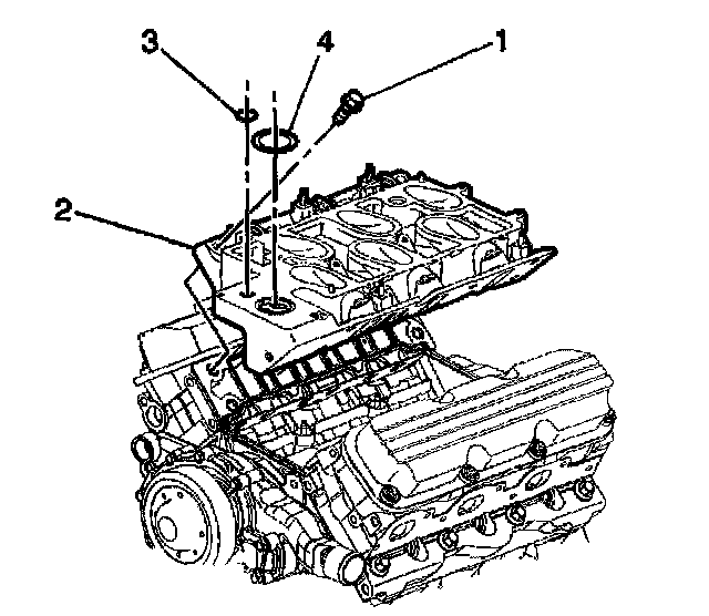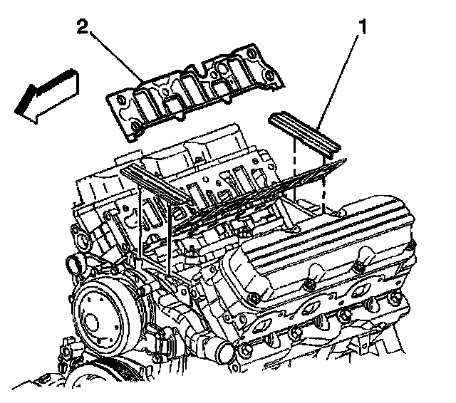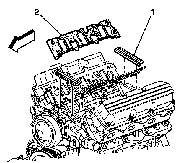 2. Install the lower intake manifold seals (1). Apply silicone sealer GM P/N 12346286 or equivalent to the ends for the manifold seals (2).