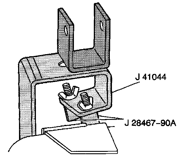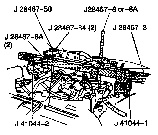 3. Install the engine support fixture adapters J 41044-1 and J 41044-2 onto the fixture adapters J28467-90A on each strut tower.